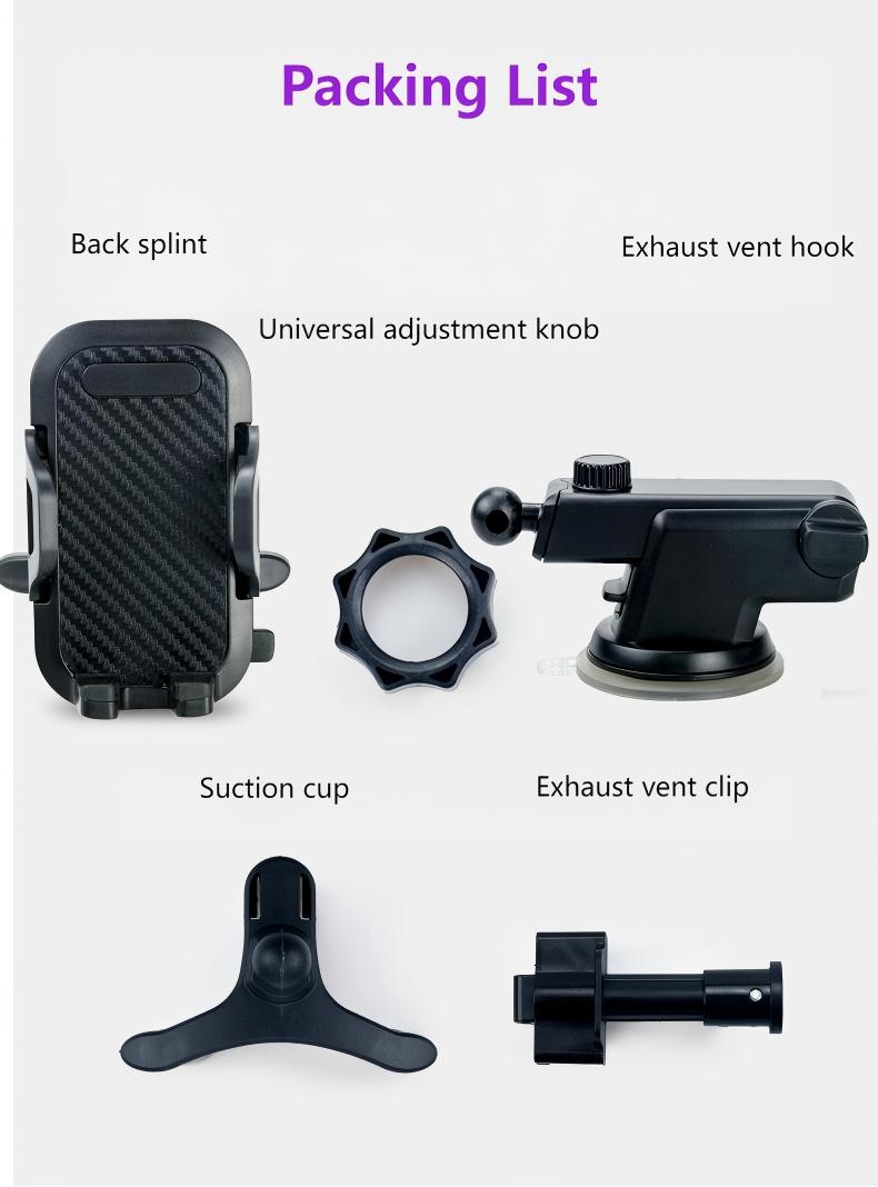 [Product Name]: Car Multi-function Phone Holder[Model]: XP019[Color]: Black[Dimensions]: Panel width 50mm, extendable to 100mm (Suction cup diameter: 68mm)[Material]: ABS, PP, PVC[Net Weight]: 170g[Gross Weight]: 230g[Package]: 1 piece / Blister Card[Carton Dimensions]: 74 × 51 × 39.5 cm[Quantity per Carton]: 100 pieces/ctn[Compatible Vehicles]: Universal; Suitable for phones with a width of 50-100mm[Installation Methods]: